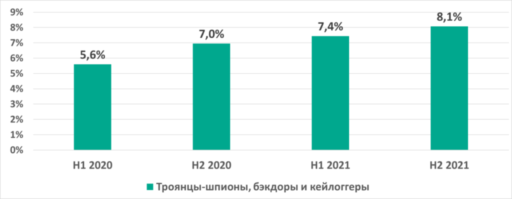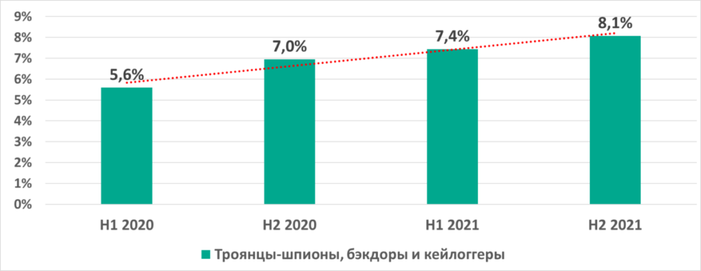 - Шпионское ПО — в 1,4 раза — с 5,6% до 8,1%.