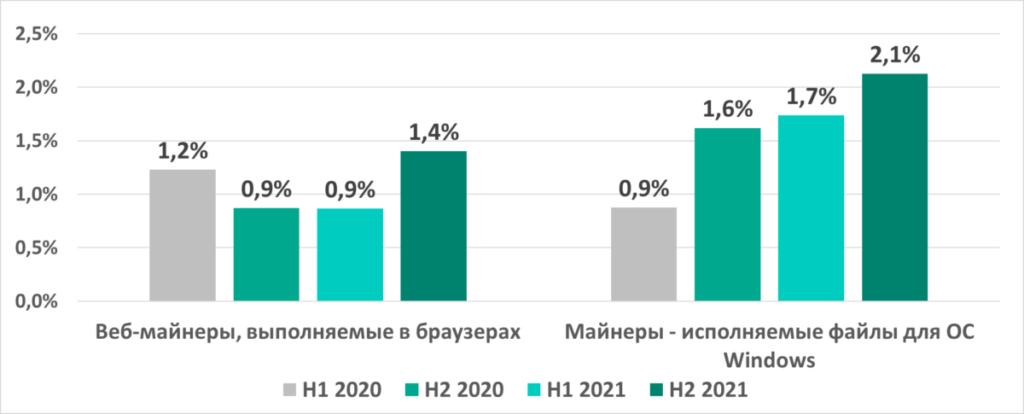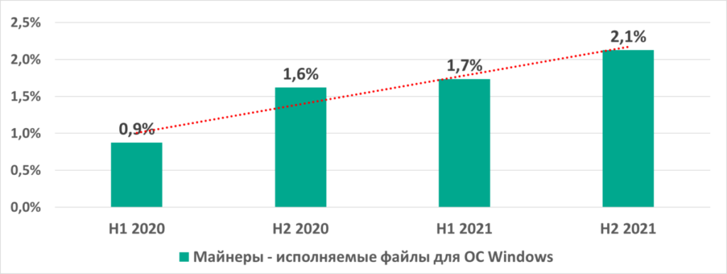 - Майнеры — исполняемые файлы для ОС Windows — более чем вдвое — с 0,9% до 2,1%.