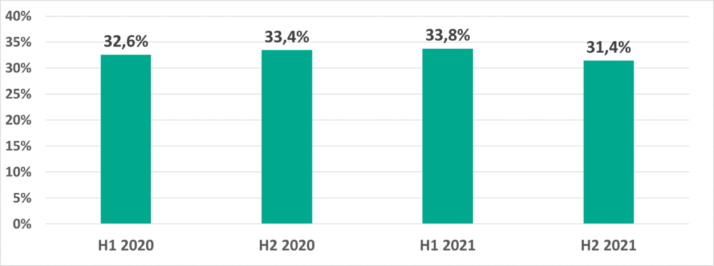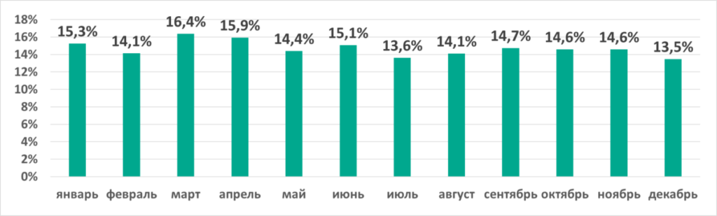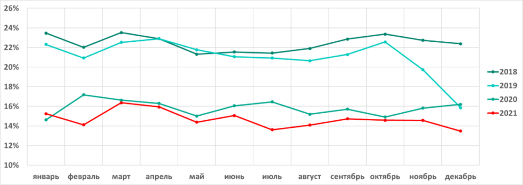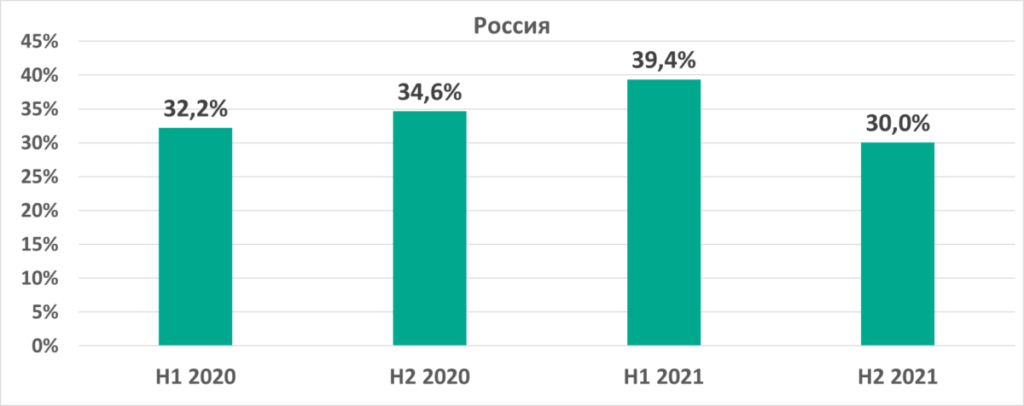 Однако если рассматривать ситуацию по полугодиям, то картинка выглядит более оптимистичной: во второй половине 2021 года впервые за полтора года показатель снизился (на 1,4 п.п.).