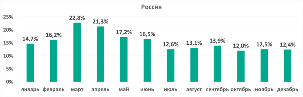 В первом полугодии процент ежемесячно атакуемых компьютеров АСУ в России был заметно выше, чем во втором полугодии. Самый высокий показатель был отмечен в марте (22,8%), самый низкий — в октябре (12,0%).
