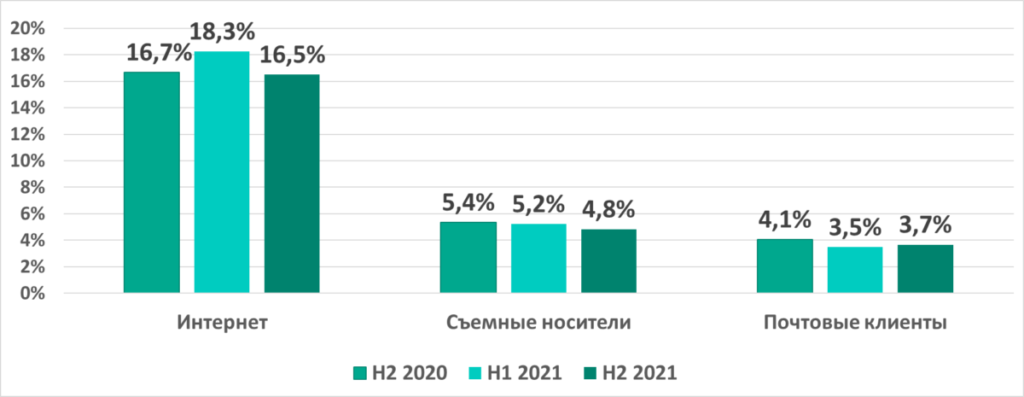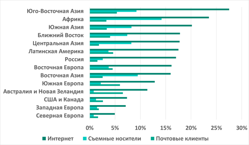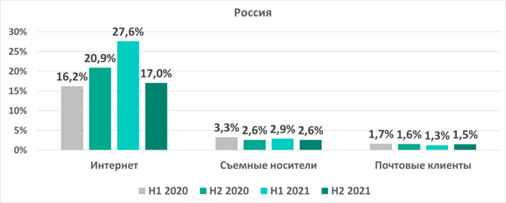 Интернет традиционно лидирует, съемные носители в статистике по миру занимают второе место, а почтовые клиенты — третье. Однако постепенно меняется соотношение между последними двумя источниками. От полугодия к полугодию показатель съемных носителей падает.