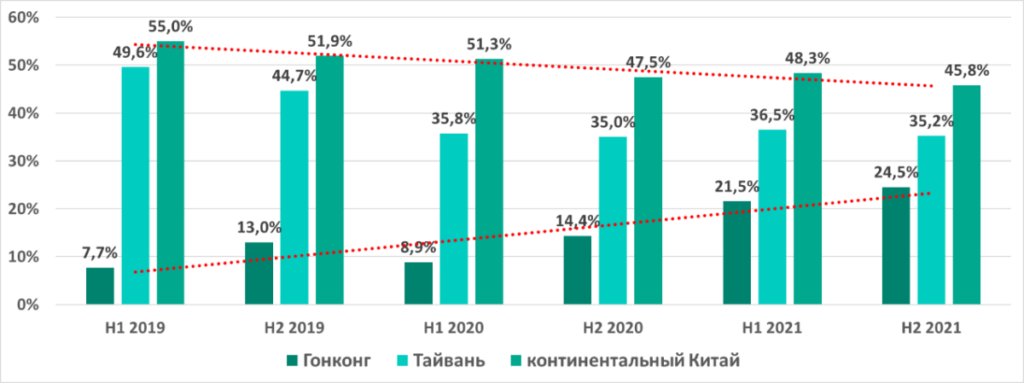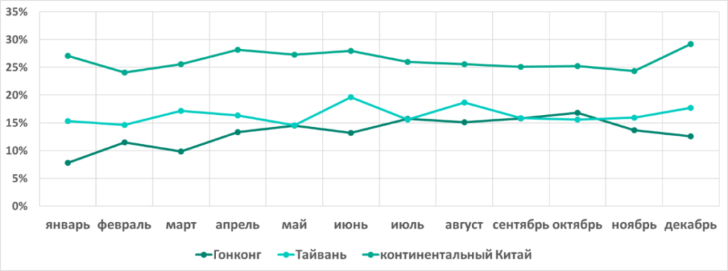 Любопытно, что при этом динамика процента атакованных компьютеров АСУ в Тайване и Гонконге по месяцам 2021 года оказывается противоположной, показатели находятся в противофазах — когда растёт показатель в Гонконге, он уменьшается в Тайване, — и наоборот.