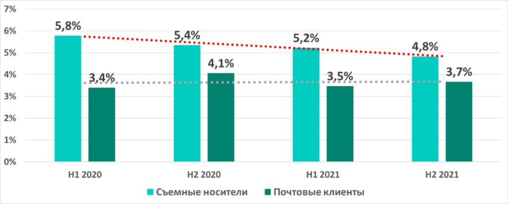 | Съемные носители | 5,2% | 4,8% | 6,7% |