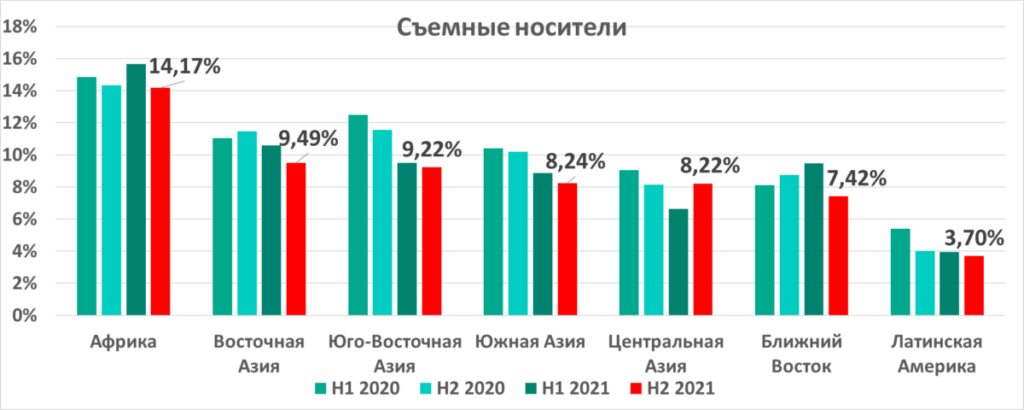 Несмотря на обнадеживающую динамику в мировой статистике, в некоторых странах процент компьютеров АСУ, где угрозы блокируются при подключении съемных носителей, все еще очень высок. Во втором полугодии 2021 лидирует Алжир с 19,7%. В то же время в Японии и в Дании на съемных носителях при подключении их к компьютерам АСУ вредоносного ПО практически не зафиксировано.