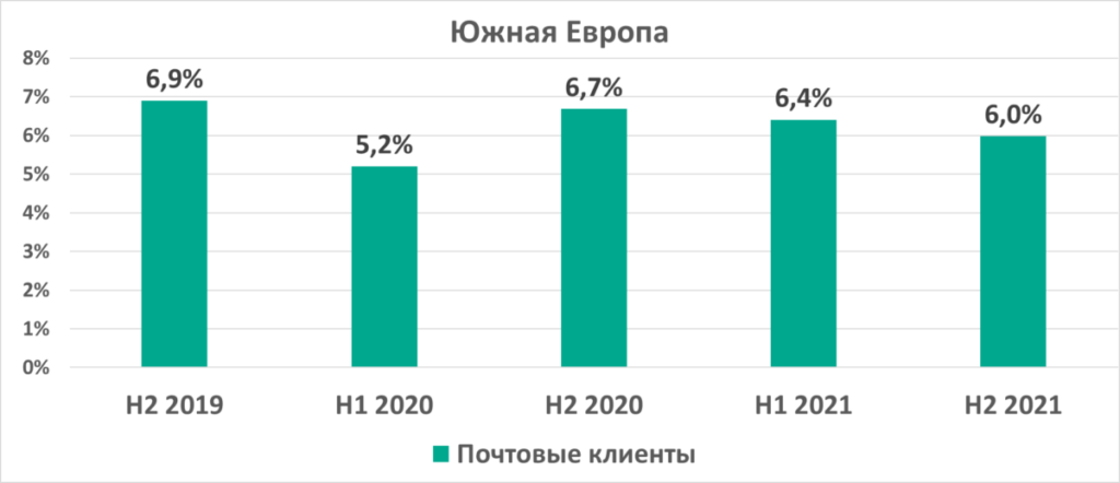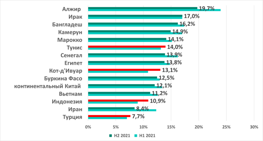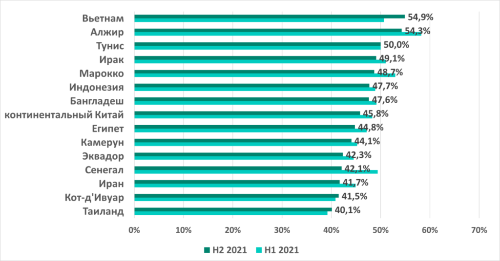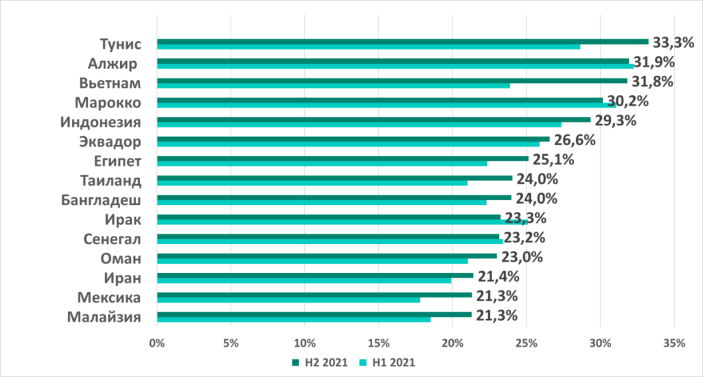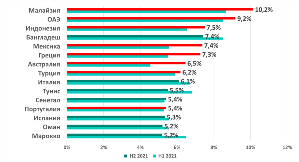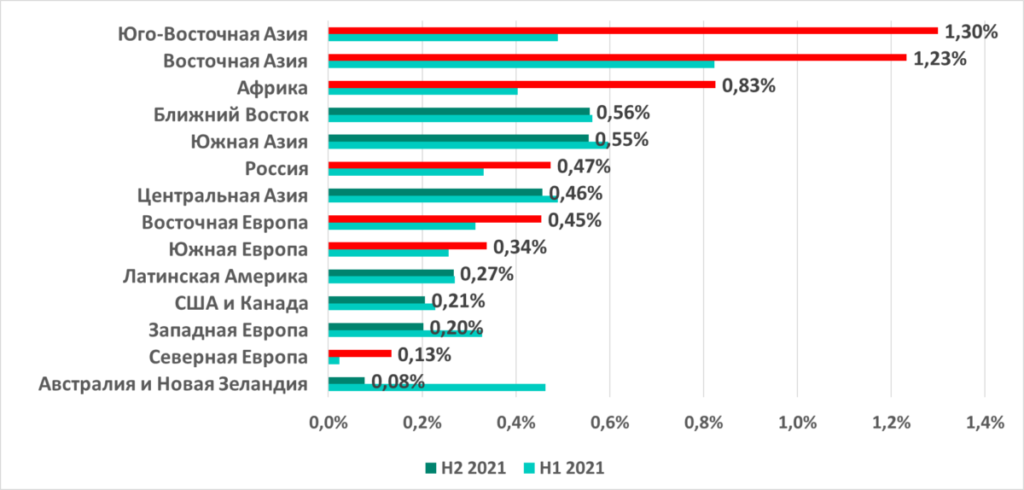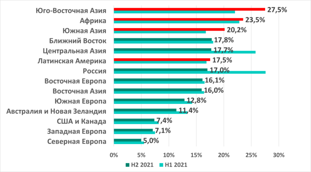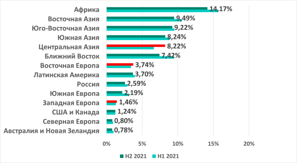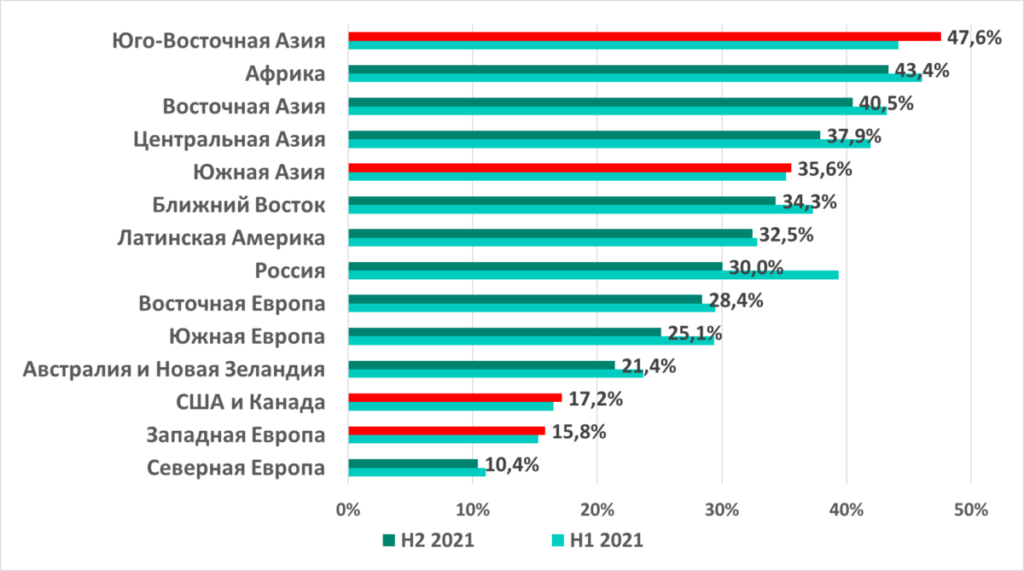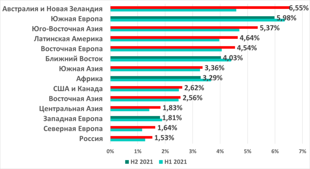 Напомним, что в первом полугодии 2021 единственным регионом, где увеличился данный показатель, был регион Австралия и Новая Зеландия (+1,3 п.п.). Во втором полугодии 2021 ситуация изменилась: показатель увеличился в десяти из четырнадцати регионов.