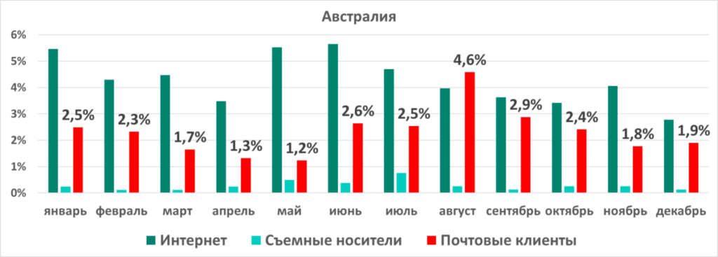 В этих регионах почта вносит заметный вклад в поток угроз. Например, в Австралии в августе 2021 года процент компьютеров АСУ, на которых были заблокированы вредоносные вложения в электронных письмах, превысил показатели остальных источников угроз, в том числе интернета.