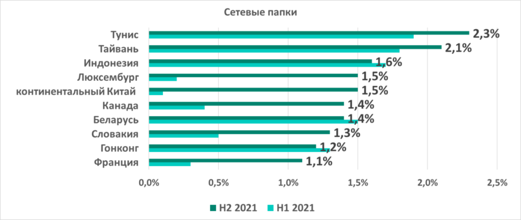 На компьютеры АСУ, где вредоносные объекты были заблокированы в сетевых папках, приходится всего 0,57%, однако этот показатель потихоньку растет и в некоторых странах и территориях уже превышает 1%.
