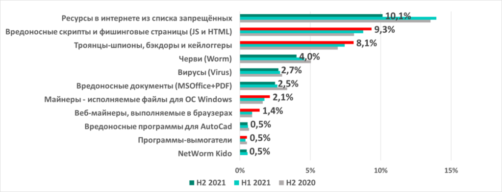 По проценту атакованных компьютеров АСУ по-прежнему лидируют ресурсы из интернета из списка запрещённых, значительная часть которых используется для распространения вредоносных скриптов и фишинговых страниц (HTML). Наиболее заметное изменение показателя — уменьшение на 3,9 п.п. — отмечено именно в этой категории.