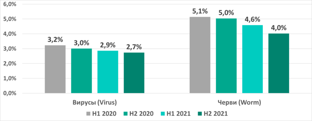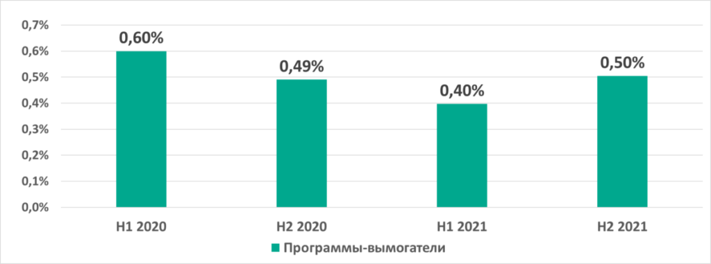 Во втором полугодии 2021 года вредоносные программы-вымогатели были заблокированы на 0,50% компьютеров АСУ.