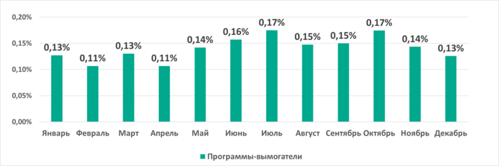 Наибольшие значения процента компьютеров АСУ, на которых были заблокированы программы-вымогатели, в течение 2021 года были отмечены в июле и октябре (0,17%), наименьшие — в феврале и в апреле (0,11%).