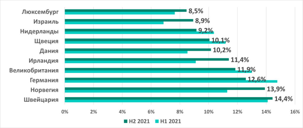 Наименьший показатель во втором полугодии 2021 был отмечен в Люксембурге.