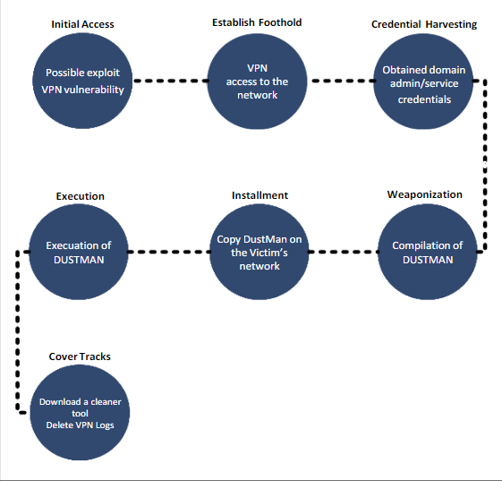 Согласно отчету NCA, первоначальный доступ к сети жертвы предположительно был получен злоумышленниками путем эксплуатации уязвимости удаленного выполнения кода в VPN-устройствах компании. После чего был получен доступ к VPN-серверу. Далее злоумышленникам удалось получить учетные записи администратора домена и службы консоли управления антивирусной системы, которые использовались для запуска и распространения вредоносного ПО. Вредоносное ПО вместе с инструментом удаленного выполнения PsExec было скопировано на сервер консоли управления антивирусной защитой, с помощью которой и был произведен запуск Dustman.