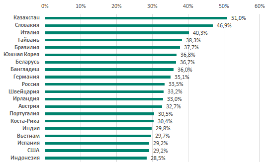 ТОП 20 стран по проценту компьютеров АСУ (по отношению ко всем компьютерам АСУ в стране), на которых в течение первого полугодия 2018 года хотя бы раз использовались RAT