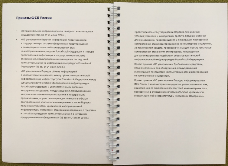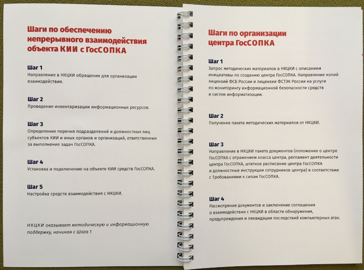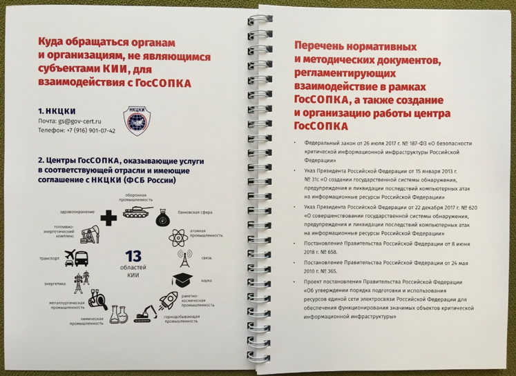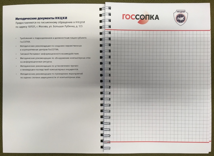 В целом, хочется отметить креативность, проявленную сотрудниками НКЦКИ, которые на своём стенде раздавали всем желающим «корпоративные» блокноты, которые содержат справочную и полезную информацию по взаимодействию с системой ГосСОПКА. К сожалению, «пока верстался номер», нас с идеей предъявить читателям содержимое блокнота НКЦКИ опередило более «бойкое перо» — Валерий Комаров, автор блога «Рупор бумажной безопасности». Поэтому мы приводим соответствующую ссылку, хотя в заметке используем собственные фото «своего» экземпляра блокнота.