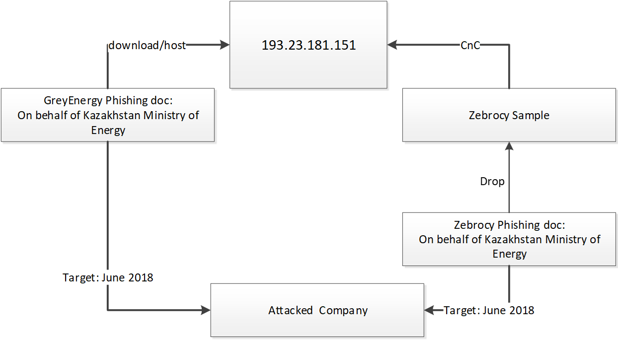 Документы целевого фишинга, использованные как GreyEnergy, так и Zebrocy, атаковали ряд промышленных компаний в Казахстане. Одну из компаний обе группировки атаковали в июне 2018 года.