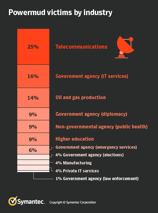 Распределение атакованных MuddyWater компаний по индустриям (источник: Symantec)