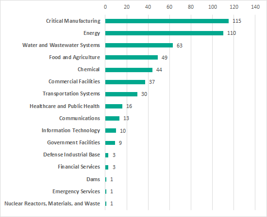 Большая часть уязвимостей затрагивает автоматизированные системы, управляющие производственными процессами различных предприятий (115), энергетикой (110) и водоснабжением (63). В числе лидеров также автоматизированные системы управления, применяемые в пищевой промышленности и сельском хозяйстве, а также в химической промышленности.