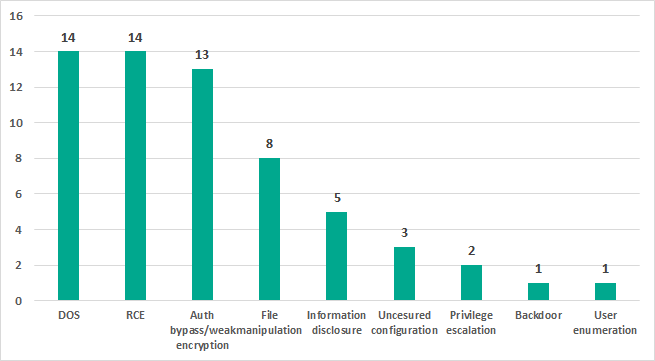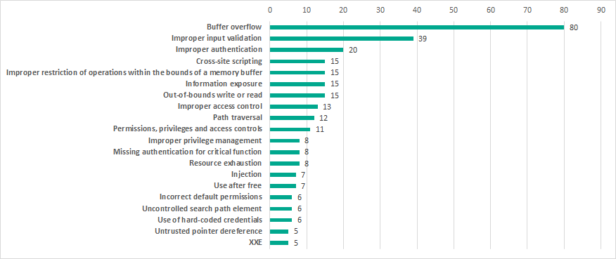 При этом 16% всех опубликованных уязвимостей связаны с проблемами аутентификации (Improper Authentication, Authentication Bypass, Missing Authentication for Critical Function) и с проблемами управления доступом (Access Control, Incorrect Default Permissions, Improper Privilege Management, Credentials Management), а 10% – являются веб-уязвимостями (Injection, Path traversal, Cross-site request forgery (CSRF), Cross-site scripting, XXE).
