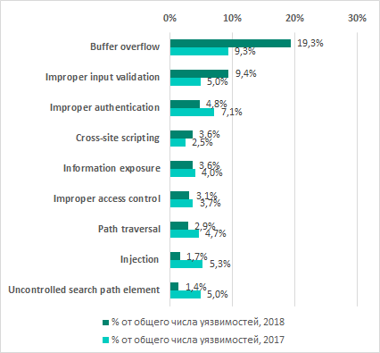 Процент уязвимостей различных типов от общего числа уязвимостей, сравнение 2018 года с 2017 годом