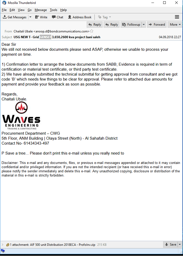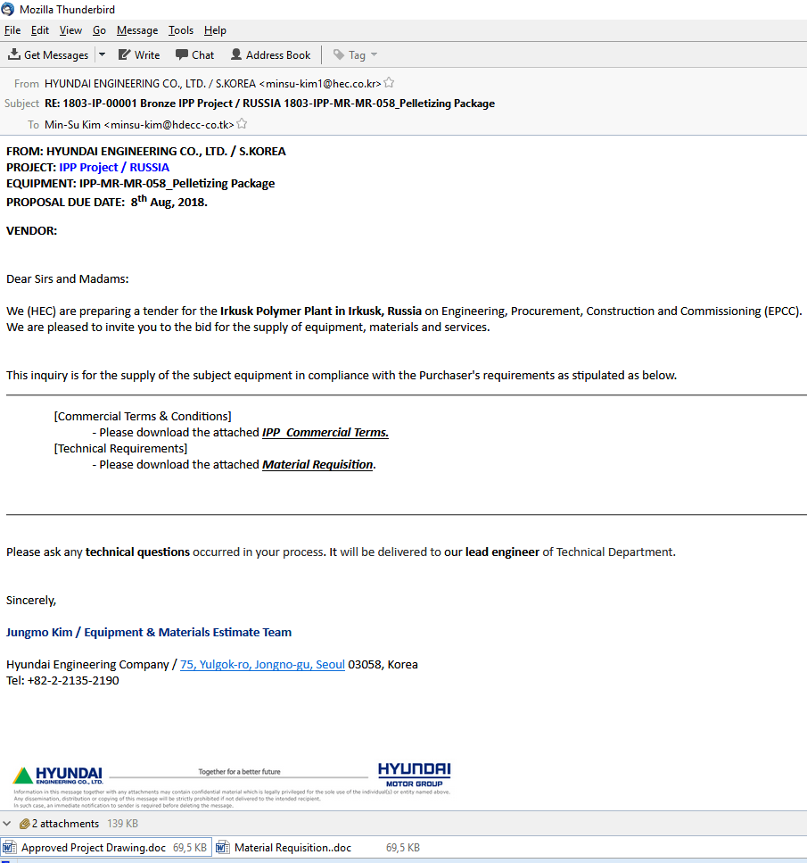 Атаки начались еще в ноябре 2017 года и, похоже, злоумышленники не собираются останавливаться. Рассылаемые письма с вредоносными вложениями замаскированы под легитимные коммерческие предложения, их содержание соответствует деятельности атакуемой организации. В более поздней волне атак фишинговые письма стали рассылать от имени партнеров атакуемой компании. Такие письма содержат архивы, защищенные паролем, указанным в тексте письма. Внутри архивов находятся вредоносные скрипты, которые устанавливают в систему вредоносное ПО и загружают с удаленного сервиса злоумышленников легитимные документы, по-видимому, ранее украденные атакующими.