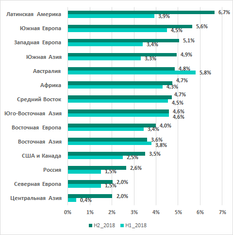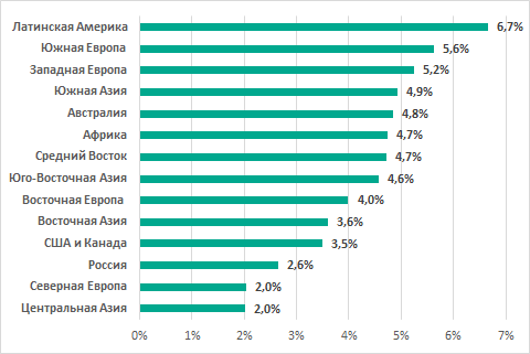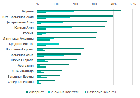 В рейтинге регионов по проценту компьютеров АСУ, на которых были заблокированы вредоносные почтовые вложения, большого разброса значений нет. Возглавляет его Латинская Америка, высокие показатели мы наблюдаем также в Южной и Западной Европе.