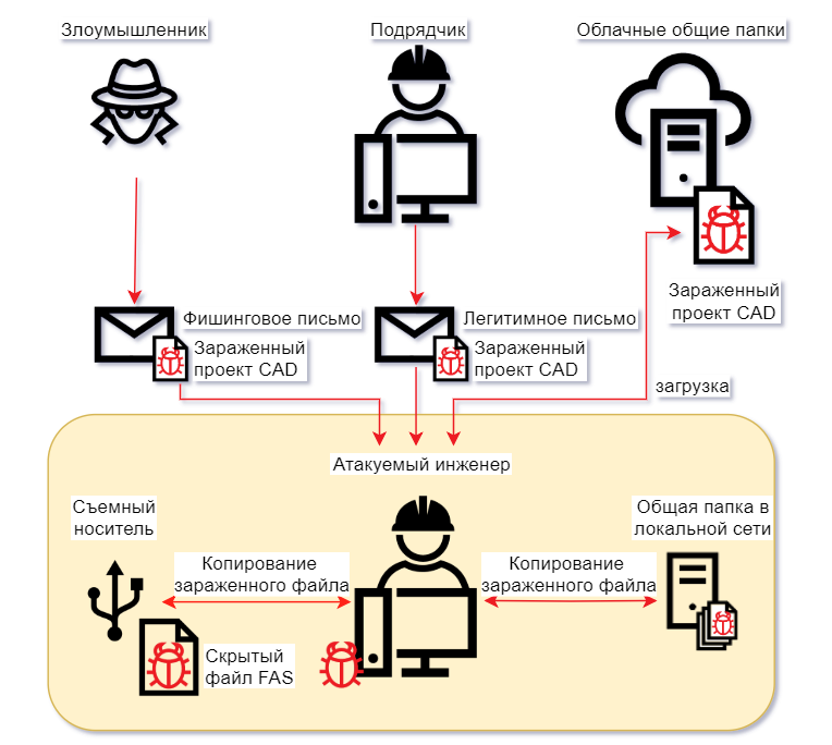 • Электронное письмо с вложением, содержащим скрытый троянский загрузчик acad.fas (вредоносное ПО прячется среди чертежей AutoCAD), отправленное ничего не подозревающим легитимным инженером из организации – подрядчика/субподрядчика;