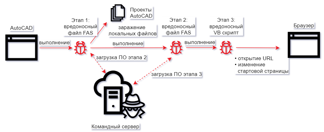 Важно отметить, что после заражения компьютера ничего не подозревающая жертва продолжает распространять вредоносное ПО, делясь с другими пользователями зараженными проектами AutoCAD через USB-носители, электронные письма, а также локальные и облачные общие папки.