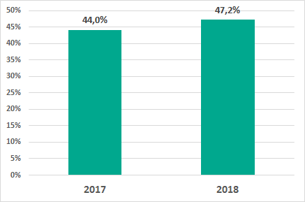 По итогам 2018 года процент компьютеров АСУ, на которых были задетектированы вредоносные объекты, вырос по сравнению с предыдущим годом на 3,2 п.п. и составил 47,2%.