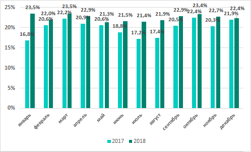 Доля компьютеров АСУ, на которых была предотвращена вредоносная активность, в 2018 году превышает аналогичный показатель 2017 года по всем месяцам.