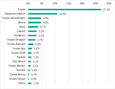 • 2,28% – вредоносные программы класса Virus.Среди этих программ уже много лет детектируются такие семейства как Virus.Win32.Sality (1,22%), Virus.Win32.Nimnul (0,87%), Virus.Win32.Virut (0,61%). Хотя эти вредоносные семейства считаются устаревшими с неактивной сетевой инфраструктурой, они традиционно вносят значительный вклад в статистику в силу самораспространения и недостаточных мер по их полному обезвреживанию.