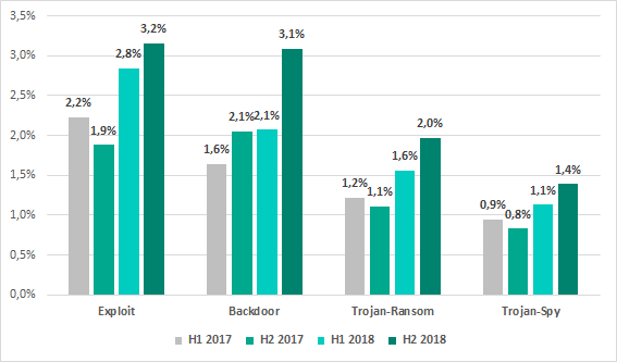 По сравнению с показателями за прошлое полугодие на 1 п.п. вырос процент компьютеров АСУ, на которых были предотвращены попытки заражения бэкдорами (Backdoor) и на 0,44 п.п. – программами-вымогателями (Trojan-Ransom).