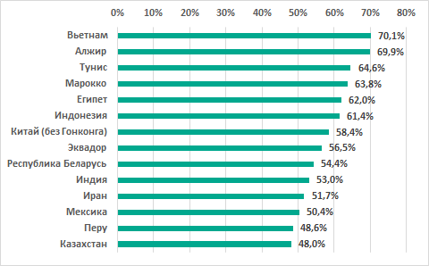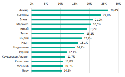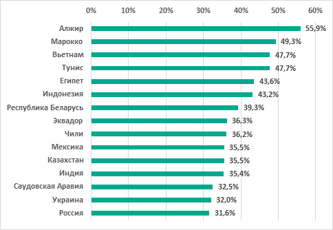 В рейтинге стран по проценту компьютеров АСУ, на которых была предотвращена вредоносная активность, список стран из первой пятёрки остался без изменений по сравнению с первым полугодием 2018 года. Тунис и Марокко поменялись местами, заняв 3-е и 4-е места, соответственно.