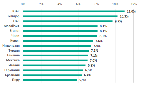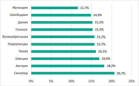 Наиболее благополучные страны в этом рейтинге – Ирландия (11,7%), Швейцария (14,9%), Дания (15,2%), Гонконг (15,3%), Великобритания (15,7%), Нидерланды (15,7%).