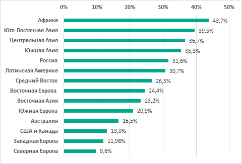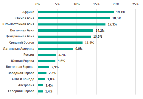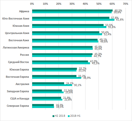 Доля машин АСУ, на которых была предотвращена вредоносная активность, значительно различается в разных регионах мира, по данному показателю традиционно лидируют Африка, Юго-Восточная и Южная Азия.