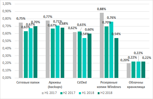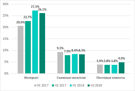 Во втором полугодии 2018 года интернет стал источником угроз, заблокированных на 26,1% компьютеров АСУ, с которых мы получаем обезличенную статистику. По сравнению с первым полугодием 2018 года этот показатель незначительно уменьшился. При этом мы наблюдаем небольшой рост процента компьютеров АСУ, на которых были заблокированы вредоносные почтовые вложения. Другие показатели по основным источникам угроз остались на уровне прошлого полугодия.