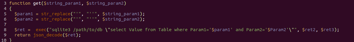 Как можно видеть на скриншоте, разработчики системы хотели избежать SQL-инъекций при помощи очень интересной фильтрации — путем дублирования кавычек в запросе, и не менее необычного способа обращения к базе данных при помощи запуска из командной строки утилиты sqlite3. Однако такая фильтрация оказалась недостаточной в связи с тем, что кавычки по-прежнему можно экранировать при помощи обратного слэша в первом параметре. Если злоумышленник поставит такой слэш, то это приведет к выходу из контекста строки во втором параметре и к возможности SQL-инъекции в запрос к базе данных.