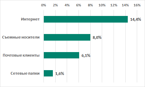 Съемные носители (8%) и сетевые папки (6,1%) чаще всего используются для распространения вредоносного ПО типа черви (Worm). Заразив компьютеры, черви, как правило, загружают на них шпионское (Spyware, Remote Access Trojan) и вымогательское (Ransomware) ПО.