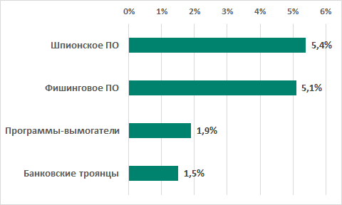 В общей сложности за третий квартал 2019 года шпионское вредоносное ПО было заблокировано на 5,4% компьютеров, используемых для сбора, обработки и хранения данных биометрии. Вредоносные программы, используемые в фишинговых атаках, и вымогательское ПО – на 5,1% и 1,9% соответственно.