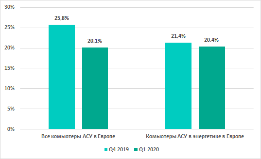 Процент компьютеров АСУ в энергетике, на которых в первом квартале 2020 года было заблокировано вредоносное ПО, сопоставим с аналогичным показателем за четвертый квартал 2019 года; при этом процент всех компьютеров АСУ в Европе, на которых было заблокировано вредоносное ПО, был в первом квартале 2020 года значительно ниже соответствующего показателя за четвертый квартал 2019 года.