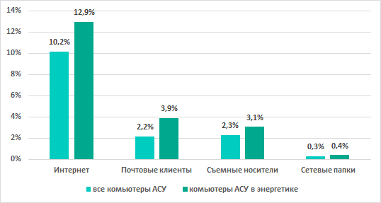 Во многих европейских странах (особенно в Швейцарии) процент компьютеров АСУ в энергетической отрасли, на которых были заблокированы почтовые угрозы, был выше соответствующего показателя для всех компьютеров АСУ в тех же странах. Причина столь высокого уровня почтовых угроз в энергетике в сравнении со всеми компьютерами АСУ — недостаточно эффективный контроль доступа к корпоративным и онлайн-сервисам электронной почты с автоматизированных рабочих мест инженеров электроэнергетических предприятий, которые, как правило, имеют доступ одновременно к технологическим и корпоративным сетям (и к интернету), а также ноутбуков инженеров предприятий электроэнергетики, которые имеют даже более широкий (т.е. еще менее строго контролируемый) доступ к сетевым ресурсам, чем автоматизированные рабочие места, особенно при использовании ноутбуков за пределами периметра безопасности предприятия.