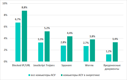 В то же время показатели по основным типам угроз, заблокированным на компьютерах АСУ и на компьютерах АСУ в энергетике, отличались более значительно.