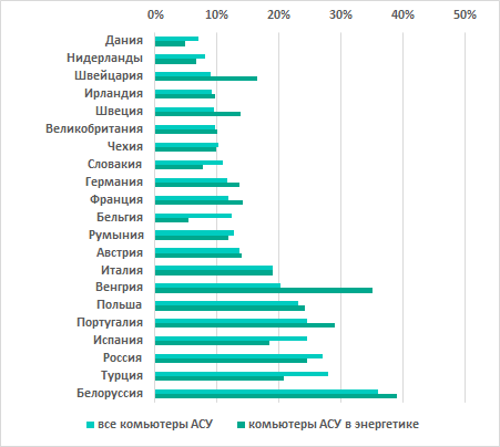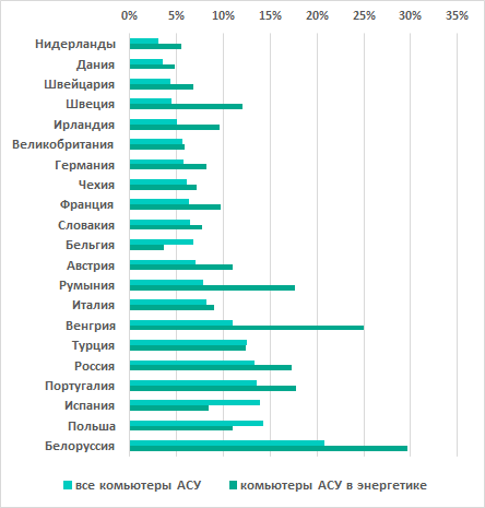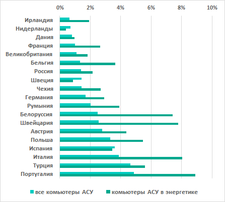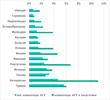 Мы сравнили по некоторым европейским странам процент всех компьютеров АСУ, на которых было заблокировано вредоносное ПО, с аналогичным показателем для энергетики.