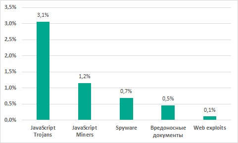 Помимо фишинга и вредоносных IP/URL-адресов, которые были заблокированы на 8,8% компьютеров АСУ, наиболее распространенными интернет-угрозами для компьютеров АСУ в энергетике Европы стали троянские программы на JavaScript (3,1%), распространяемые через вредоносные рекламные баннеры и фишинговые сайты и применяемые для доставки различных навязчивых рекламных программ (adware) и майнеров криптовалют.