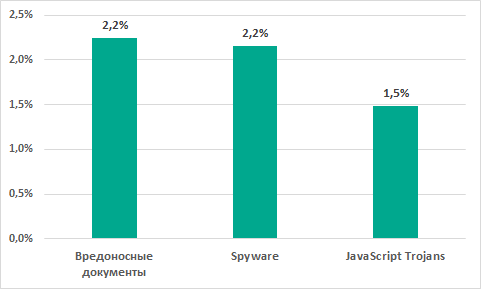Было заблокировано в общей сложности 1485 модификаций вредоносного ПО из 633 различных семейств, в том числе различные многофункциональные шпионские программы (4,4%), предназначенные для кражи данных аутентификации и позволяющие злоумышленникам удалённо управлять зараженными компьютерами в автоматическом и ручном режиме, а также вредоносные программы-вымогатели (1%) и эксплойты для популярных офисных программных пакетов (3,4%), внедренные в документы, распространяемые через фишинговые рассылки и применяемые для развертывания шпионского ПО и программ-вымогателей — угроз, представляющих особую опасность и способных негативно влиять на доступность и целостность систем и сетей АСУ ТП.
