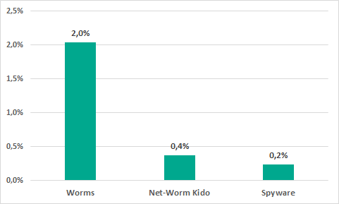 Среди угроз, заблокированных на съемных носителях, наиболее часто встречались черви (включая сетевой червь Kido) – по большей части старые варианты, впервые обнаруженные десятилетие назад, но все еще распространяющиеся в сетях АСУ. Это типичная ситуация для АСУ, которая вызвана в первую очередь отсутствием самых необходимых мер по обеспечению безопасности на некоторых сетевых узлах, что позволяет данным червям «выживать» в течение столь долгого времени.