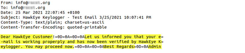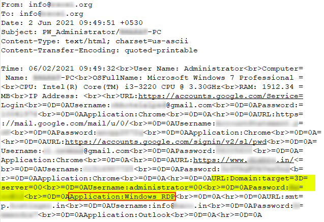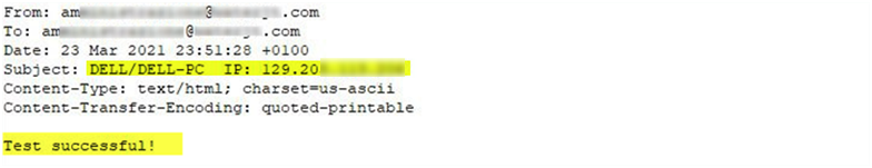 Ниже, на скриншоте тестового сообщения, отправленного средством сборки шпионской программы на сервер сбора данных, видно, что подобные сообщения могут содержать полезные сведения об инфраструктуре, используемой злоумышленниками: поле темы тестового сообщения содержит имя пользователя, имя компьютера и IP-адрес машины, с которой было отправлено сообщение.