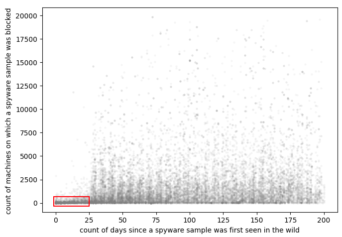 Расскажем подробнее об аномалии. Анализ 58 586 образцов программ-шпионов, заблокированных в первом полугодии 2021 года, показал, что 12 420 (21,2%) из них были значительно меньше распространены (по общему количеству компьютеров, на которых был заблокирован образец вредоносного ПО, включая компьютеры, не связанные с АСУ), а промежуток времени (в днях) между первой и последней датой обнаружения вредоносного ПО — значительно короче, чем в обычных атаках шпионского ПО. Показатели таких «аномальных» шпионских программ отмечены красным прямоугольником на графике ниже. Видно, что продолжительность атак невелика и, как правило, не превышает 25 дней. При этом количество атакованных компьютеров составляет менее 100, из которых 40-45% — это машины АСУ, а остальные чаще всего являются частью ИТ-инфраструктуры тех же организаций.