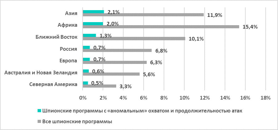 В Африке (2% из 15,4%), на Ближнем Востоке (1,3% из 10,1%), Европе (0,7% из 6,3%), России (0,7% из 6,8%), Австралии и Новой Зеландии (0,6% из 5,6%) и в Северной Америке (0,5% из 3,3%) приблизительно каждая десятая атака с использованием шпионских программ была «аномальной».
