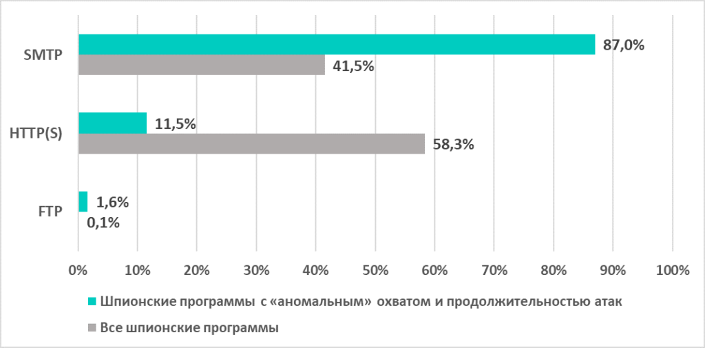 Около 18,9% «аномальных» образцов шпионских программ было сконфигурировано для подключения к почтовым серверам, принадлежащим промышленным предприятиям, которые ранее стали жертвами их атак.