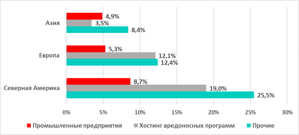 Это неожиданный результат, поскольку 34,6% атакованных компьютеров АСУ принадлежат азиатским компаниям. Однако по результатам анализа выяснилось, что неожиданно большое количество азиатских промышленных компаний среднего размера размещает свою публичную инфраструктуру (DNS-серверы, корпоративные веб-серверы и почтовые серверы) не в Азии, а в Америке — на серверах, арендованных либо непосредственно у американских провайдеров, либо у азиатских провайдеров-посредников, фактически предоставляющих доступ к инфраструктуре американских провайдеров.